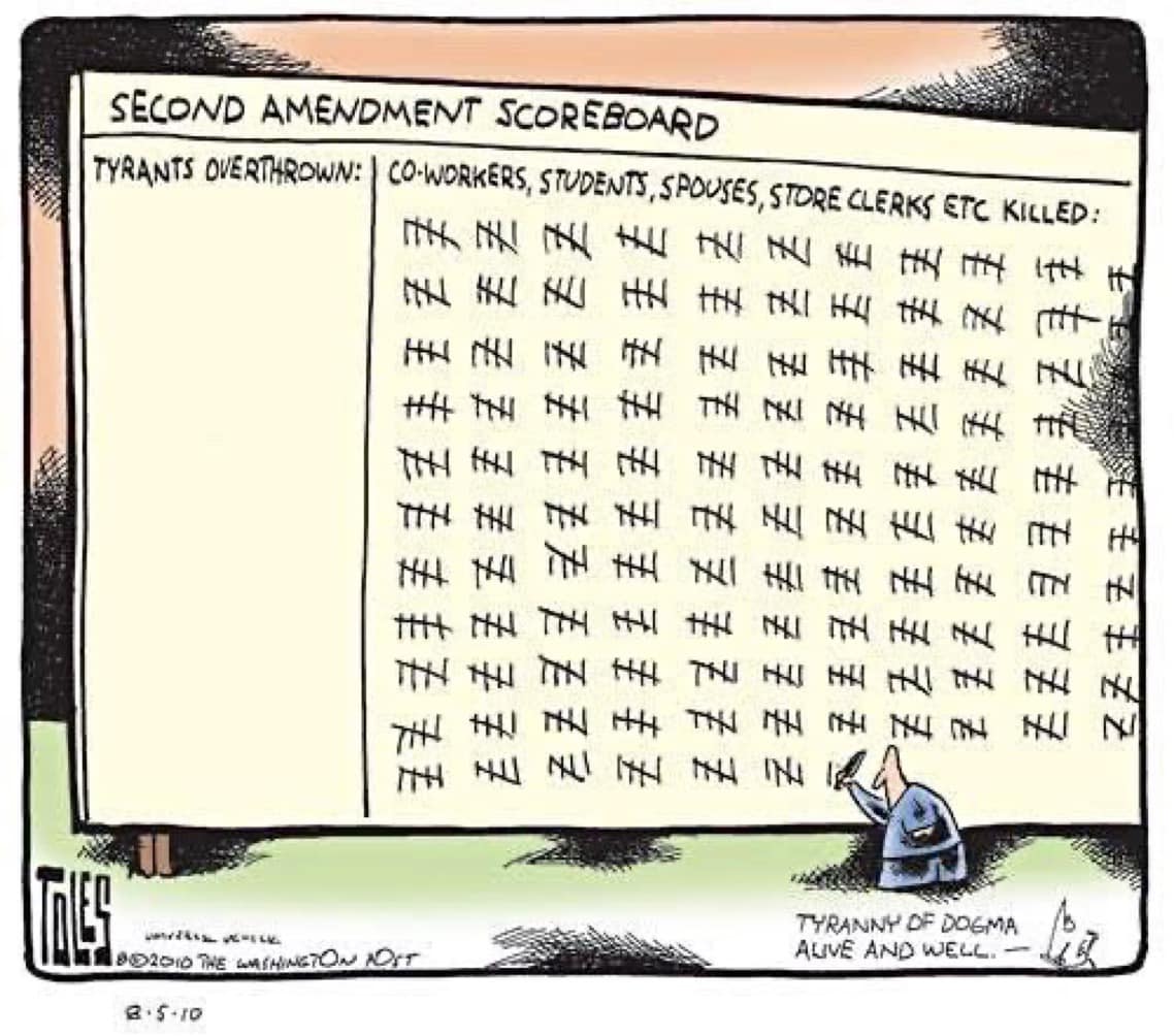 The thing about that particular editorial cartoon is that it was published not long after Sandy Hook. That was a watershed moment for this country. It’s when 2A advocates and absolutists locked arms and decided that the slaughter of 2nd-graders was a small price to pay for ” … our God given right to own guns.”